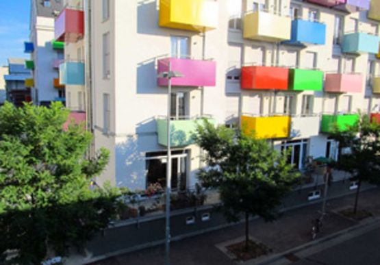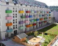 Die bunten Balkone erinnern an eine zwischenzeitliche Nutzung der Gebäude durch alternative Gruppen. Heute gibt es 158 Wohnungen, die zum Teil auch als Wohngemeinschaften genutzt werden.